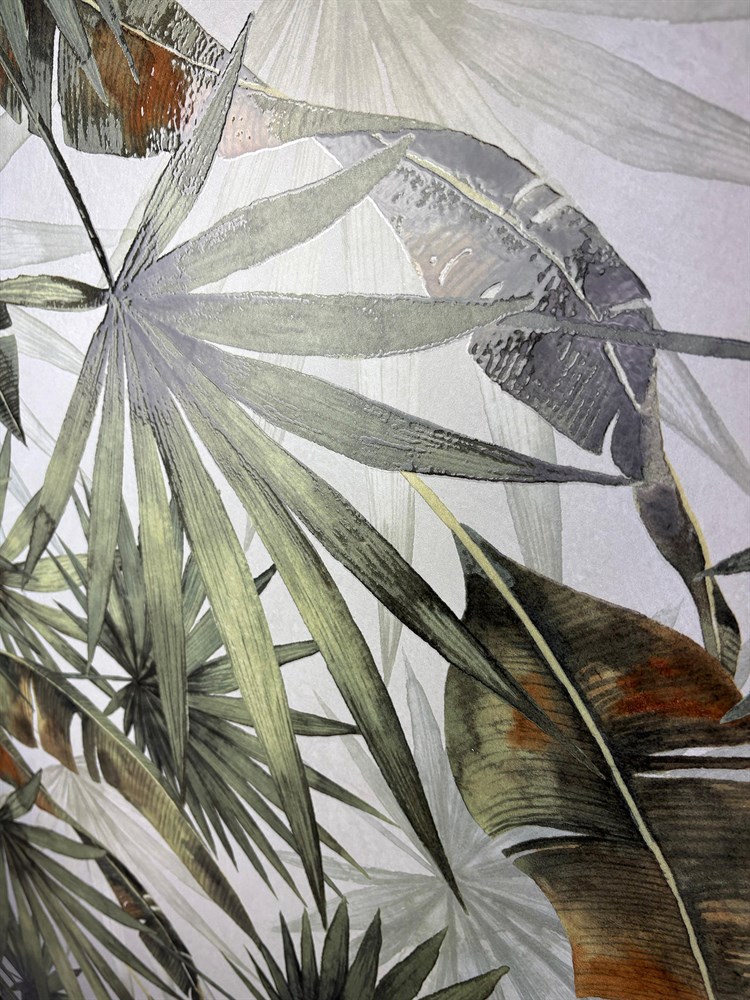 Рисунок представляет собой изысканную композицию из тропических листьев с мягкими волнообразными контурами. Изящные прожилки и плавные изгибы создают эффект натуральности, будто на поверхность действительно уложили свежие листья. Рисунок имеет выраженный объем – некоторые элементы слегка приподняты, что создает интересную игру света и тени при изменении угла освещения.