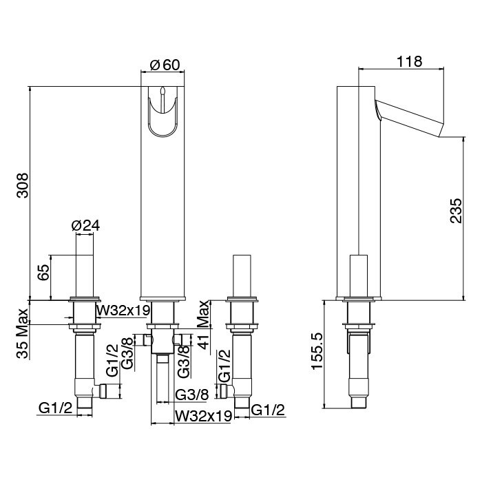 Высокий, 3 отверстия, автоматический слив 1”1/4