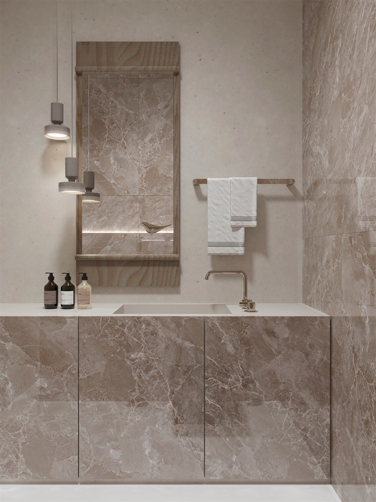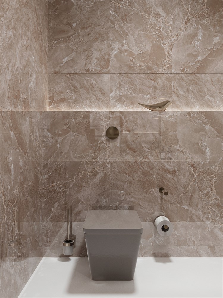 MODENA BROWN — роскошный керамогранит коричневого оттенка с эффектом мрамора, создающий атмосферу утонченной элегантности. Этот материал не только привносит нотки высокой эстетики, но и наполняет пространство светом и динамикой, подчеркивая каждую деталь интерьера.