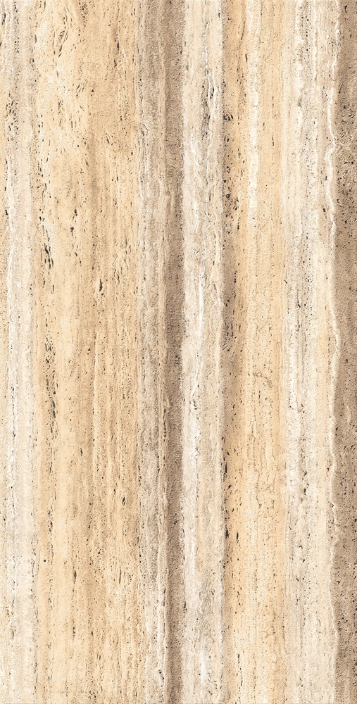 Фактурная поверхность материала с мягким рельефом точно передает природную эстетику травертина, создавая эффект натуральности. Продольные прожилки различных оттенков добавляют динамику, подчеркивая естественную красоту камня. Теплый бежевый фон с контрастными переходами тонов придает интерьеру особую глубину и уют.
