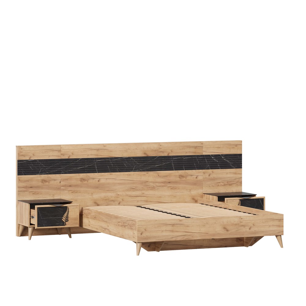 Шелли Кровать двуспальная 1600 с тумбами и декоративным щитом (Дуб золотой/Мрамор черный)