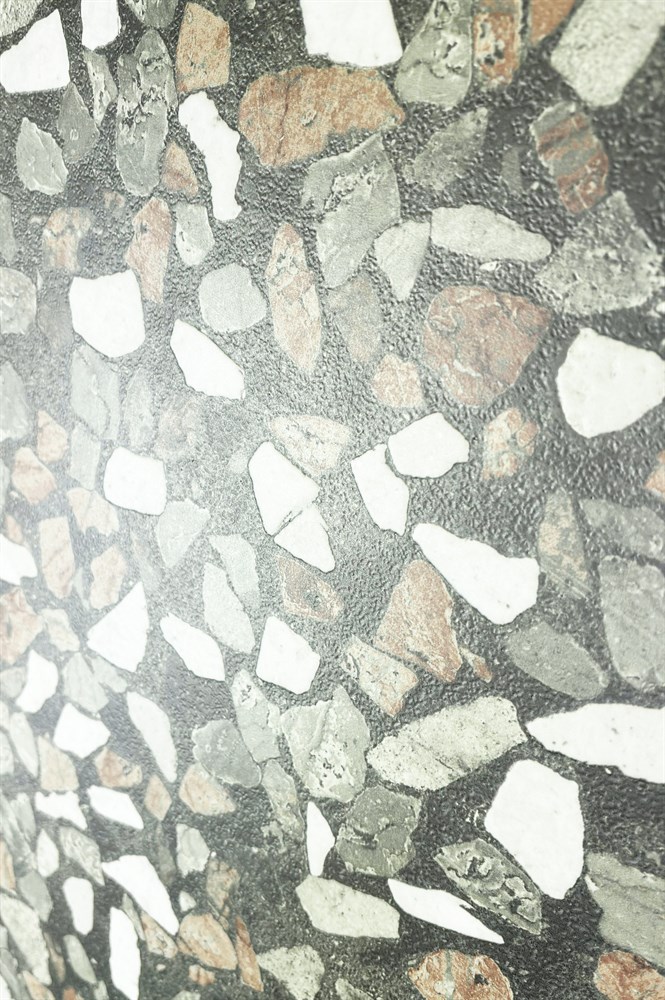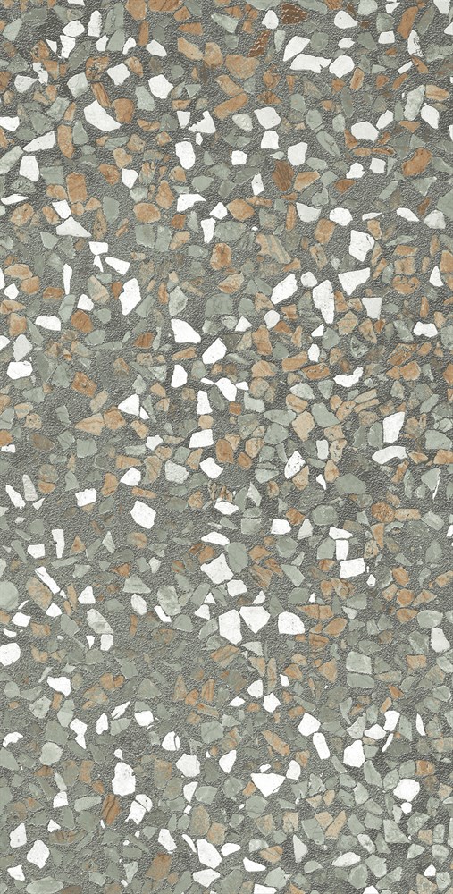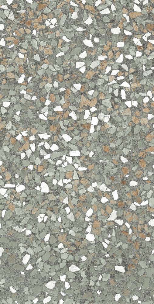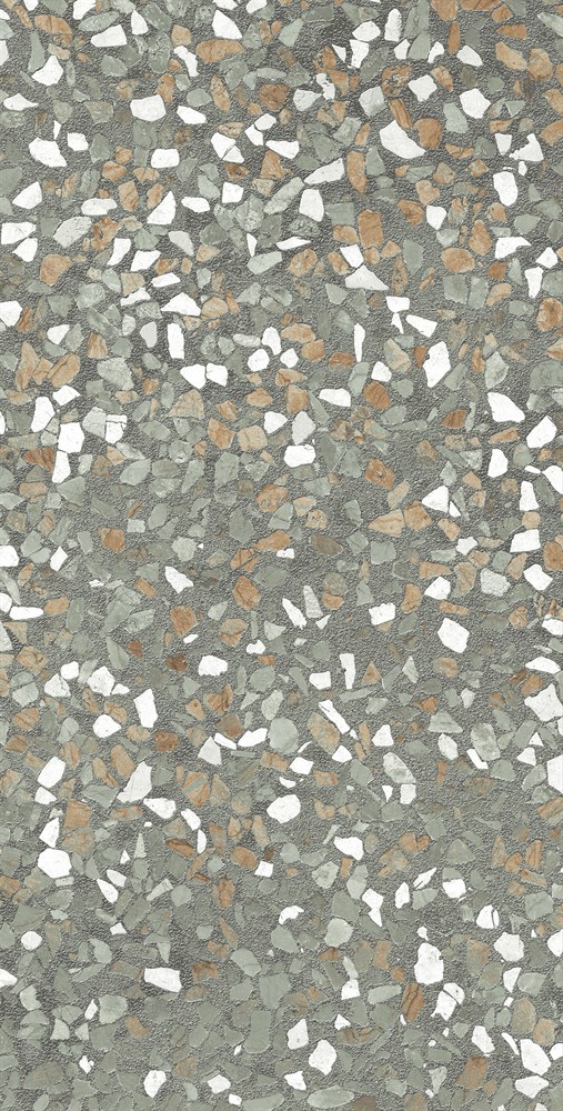 Коллекция передает характер натурального терраццо с его сложной текстурой, где мелкие фрагменты камня создают живописную мозаику в мягкой зеленовато-землистой гамме.